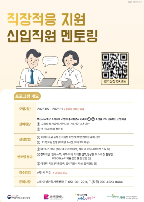 사하구 관계자는 “직장적응 지원사업은 신입직원이 조직에 빠르게 적응하고 핵심 구성원으로 성장할 수 있도록 돕는 중요한 발판”이라며 “신입직원의 이탈 문제로 고민하는 기업과 성공적인 직장 생활을 꿈꾸는 청년들의 많은 관심과 참여를 기대한다”고 말했다.