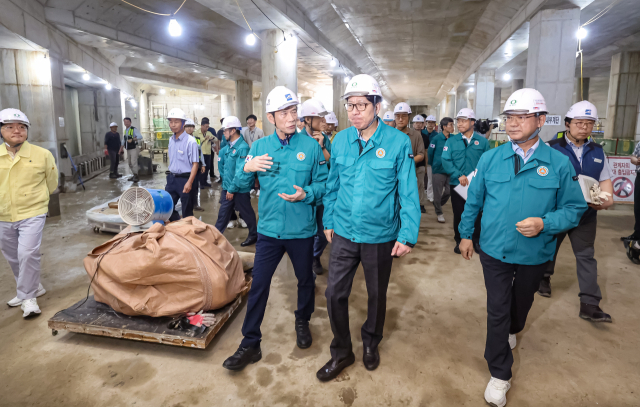 17일 오후 부산 사상구 부산도시철도 사상~하단선 501 정거장 공사현장에서 박형준 부산시장과 이병진 부산교통공사 사장이 현장점검을 하고 있다. 이 현장은 지난 14일 새벽에 내린 폭우로 침수 피해가 발생했다. 김종진 기자 kjj1761@
