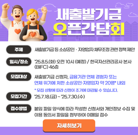 이어서 8월 5일(화) 캠코 본사가 위치한 부산국제금융센터(BIFC)(부산광역시 남구 소재)에서 부산지역 소상공인 20명을 초청해 금융위원회․캠코․신복위․신정원 관계자가 참석하는 ‘부산지역 소상공인 오픈간담회’를 개최한다.