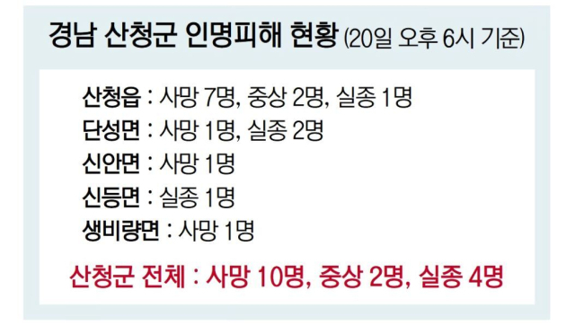 20일 경남도 등에 따르면 이날 오후 6시 기준 산청군 인명 피해는 사망 10명, 중상 2명, 실종 4명이다. 전날까지 사망자는 6명이었지만, 20일 실종됐던 4명이 숨진 채 발견됐다. 아직 실종자가 4명 남아 있어 사망자는 더 늘어날 수도 있을 것으로 예상된다.