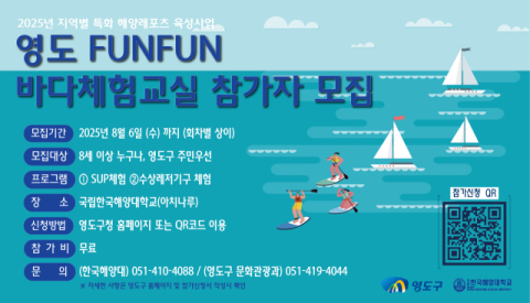 김기재 영도구청장은 “이번 영도 펀펀(FUNFUN) 바다체험교실은 주민 누구나 쉽게 접근할 수 있는 해양레포츠 프로그램으로 해양관광도시 영도의 가능성을 직접 체험해볼 수 있는 기회가 될 것”이라며 “많은 분들이 해양레포츠에 대한 흥미를 갖고, 영도의 해양공간이 가진 새로운 가치를 발견하는 계기가 되길 바란다”고 밝혔다.