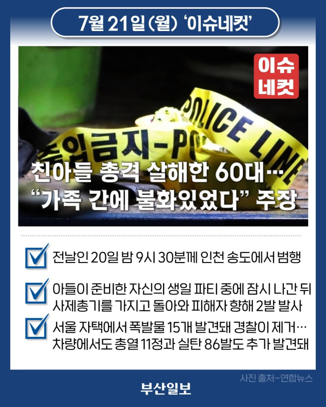 경찰이 인천 송도에서 사제 총기로 아들을 살해하고 서울 자택에 인화성 물질과 발화 타이머를 설치한 60대 남성 A 씨를 체포해 구속영장을 신청했습니다. A 씨는 전날 오후 9시 30분께 인천시 연수구 송도동 모 아파트에서 사제 총기를 발사해 아들인 30대 B 씨를 살해한 혐의를 받는데요. 범행 당일 A 씨의 생일을 맞아 아들 B 씨가 잔치를 열었지만, A 씨는 밖에 나갔다 온다고 한 뒤 차량에 보관 중인 사제 총기를 들고 와 B씨 복부를 향해 2발을 격발했습니다. A 씨의 서울 자택에서는 시너가 담긴 페트병, 세제통, 우유통 등 인화성 물질 15개와 점화장치가 발견됐으며, 차에서도 범행에 사용한 사제 총기 2정 이외에 추가로 총신(총열) 11정과 실탄 86발이 발견됐습니다. A 씨는 경찰 조사에서 아들을 살해한 이유와 관련해 "가정불화가 있었다"면서도 구체적인 범행 동기는 진술하지 않은 것으로 알려졌습니다.