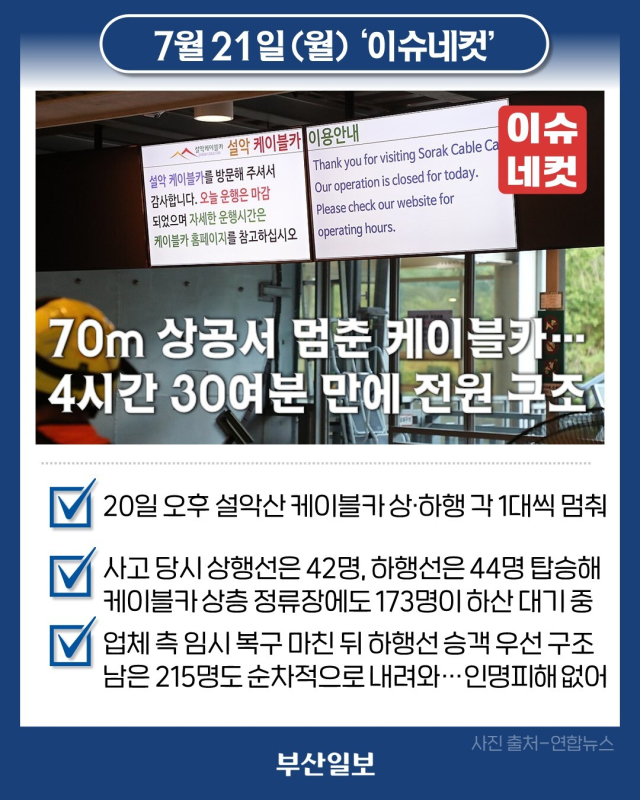 전날인 20일 오후 4시께 강원도 속초시에 있는 설악산 케이블카 상·하행 케이블카가 각 1대씩 총 2대가 약 70m 상공에서 운행 중 멈췄습니다. 사고 당시 상행선에는 42명, 하행선에는 44명이 타고 있었고, 케이블카 상층 정류장 인근에도 173명이 하행선을 타기 위해 대기 중이었는데요. 운영업체는 임시 복구를 마치고 소방 당국과 함께 오후 6시 10분께 하행선에 타고 있던 44명을 우선 구조했습니다. 이어 상행선 탑승객 42명을 포함해, 위에서 대기하고 있던 총 215명이 순차적으로 하산해 오후 8시 30분께 전원 구조됐습니다. 소방 당국은 탑승장 인근에 대기하며 하산한 탑승객들 건강을 살폈고, 다행히 병원에 이송된 인원은 없었습니다.
