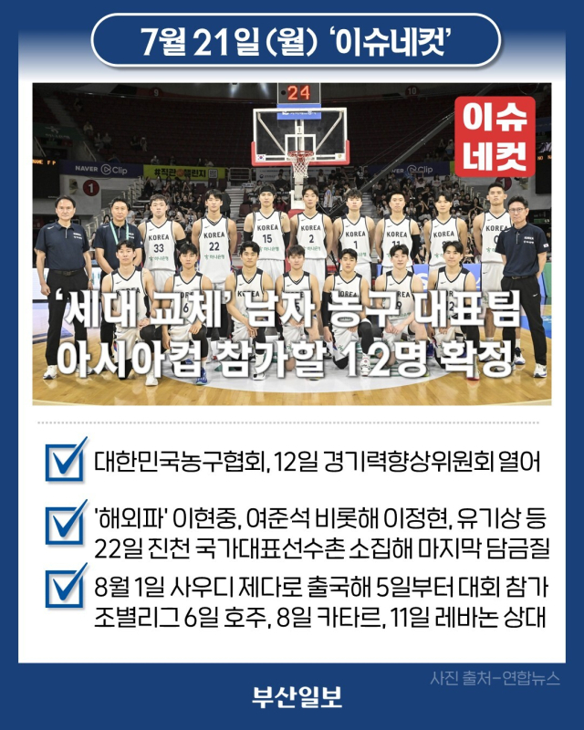 대한민국농구협회는 21일 경기력향상위원회를 열어 2025국제농구연맹(FIBA) 아시아컵에 출전할 선수 12명을 선발했다고 밝혔습니다. 대표팀의 에이스로 자리매김한 '해외파 듀오' 이현중, 여준석을 비롯해 이정현(소노), 유기상, 양준석(이상 LG)이 최종 엔트리에 이름을 올렸는데요. 다음 달 5일부터 사우디아라비아 제다에서 열리는 대회를 위해 안준호 대표팀 감독은 일본·카타르와 2경기씩 치르는 평가전을 통해 선수들의 기량을 점검했습니다. 대표팀은 이달 22일 진천 국가대표선수촌에 소집해 마지막 담금질을 이어가며, 8월 1일 사우디아라비아로 출국해 조별리그에서 8월 6일 호주, 8일 카타르, 11일 레바논과 차례로 맞붙습니다.