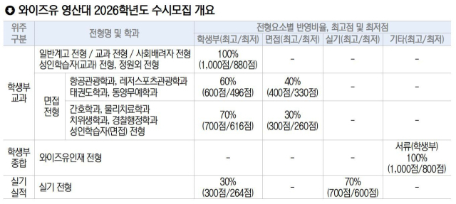 와이즈유인재전형은 학생부종합전형으로, 학업역량·진로역량·공동체역량을 서류 기반으로 100% 평가하며, 실기전형은 실기고사 70%, 학생부 교과 30%로 구성된다. 이상배 기자