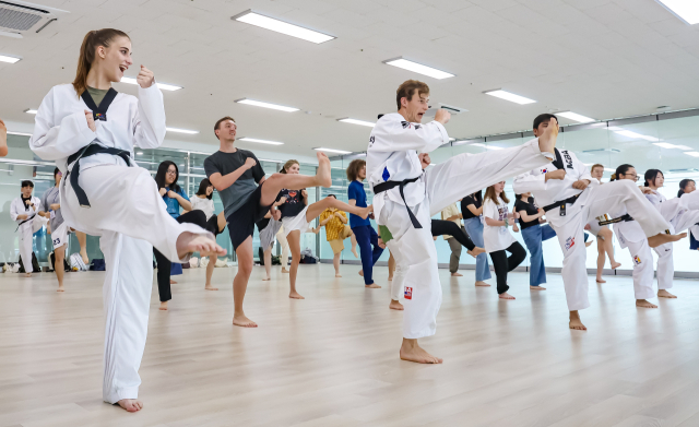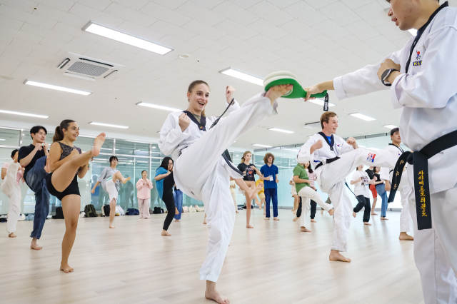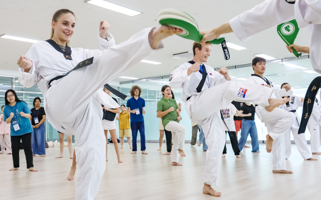 22일 오후 부산 남구 국립부경대학교 대연캠퍼스에서 부경국제계절학기에 참가한 외국인 대학생들이 태권도를 배우고 있다. 올해는 미국, 영국, 오스트리아, 중국, 일본 등 9개국 23개 자매대학에서 온 외국학생 97명과 국립부경대생 29명이 참가했다. 김종진 기자 kjj1761@