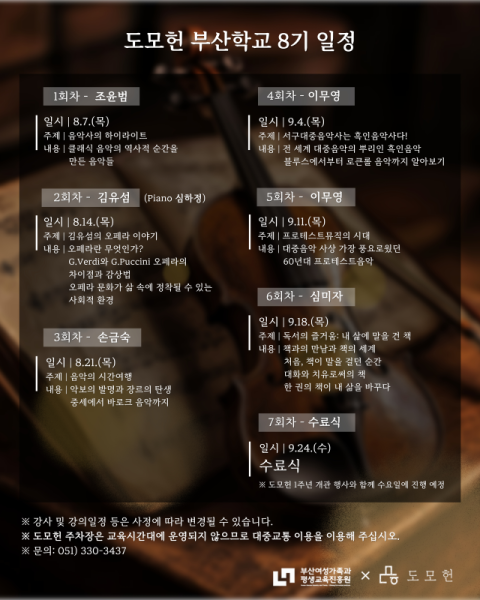 ‘도모헌 부산학교 8기’는 ▲1회차(8.7.)에 조윤범 바이올리니스트 겸 음악해설가의 ‘음악사의 하이라이트’ ▲2회차(8.14.)는 소프라노 김유섬의 ‘김유섬의 오페라 이야기’ ▲3회차(8.21.)는 손금숙 음악학 박사의 ‘음악의 시간여행’ ▲4회차(9.4.)는 이무영 음악감독 겸 팝 칼럼니스트의 ‘서구대중음악사는 흑인음악사다!’ ▲5회차(9.11.)는 이무영 음악감독 겸 팝 칼럼니스트의 ‘프로테스트뮤직의 시대’ ▲6회차(9.18.)는 심미자 부산디지털대학교 평생교육학과 교수의 ‘독서의 즐거움 : 내 삶에 말을 건 책’ ▲7회차(9.24.)는 수료를 축하하고 의미를 되새기는 수료식 및 네트워킹 데이로 도모헌 개관 1주년 기념 행사와 함께 수요일에 진행된다.