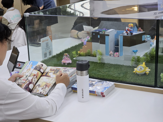 1층 만화라운지에 있는 디오라마 테이블. 연산로타리, 연산 고분군, 온천천 세병교 등 연제구의 상징적 장소와 만화 주인공들이 어우러진 조형물과 함께 만화책을 감상할 수 있는 공간이다.