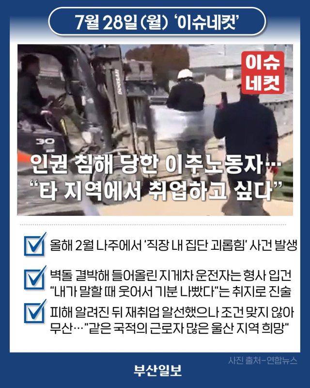 지난해 12월 고용허가제(E-9)를 통해 입국한 스리랑카 국적의 이주노동자 A(31) 씨가 올해 2월 전남 나주의 한 공장에서 벽돌 더미에 묶인 채 지게차로 들어 올려지는 등 '직장 내 괴롭힘' 피해를 당했습니다. 최근 이재명 대통령이 이러한 인권 침해 사실을 언급하고 대책 마련을 주문하면서 관심이 커졌는데요. 이후 형사 입건된 한국인 지게차 운전자는 자신이 말할 때 A 씨가 웃었고, 이 때문에 기분이 나빴다는 취지로 경찰 조사에서 진술한 것으로 전해졌습니다. 당국에서는 근로자 노동환경 실태 조사에 착수한 가운데, A 씨에 대한 채용 의사를 밝힌 지역 내 다른 업체로의 재취업도 알선했지만 급여 등의 조건이 맞지 않아 무산됐습니다. A 씨는 자신과 같은 국적의 근로자들이 많이 근무하고 있는 울산 지역으로 사업장 변경을 희망한 것으로 전해졌습니다.