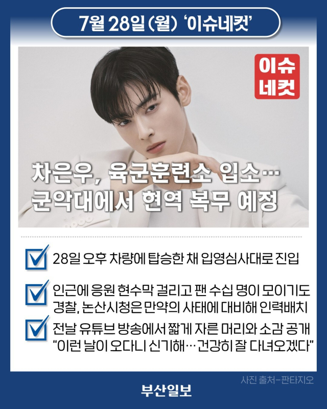 그룹 아스트로 멤버 겸 배우인 차은우가 28일 오후 2시께 충남 논산 육군훈련소에 입소했습니다. 차은우는 기초군사훈련을 받은 뒤 육군 군악대에서 병역을 이행할 예정인데요. 이날 훈련소 주변에는 차은우의 건강한 군 복무를 기원하는 팬들의 현수막이 걸린 가운데, 그의 입소를 배웅하는 팬 수십 명이 모이기도 했는데요. 경찰과 육군훈련소, 논산시청은 만약의 사태에 대비해 인력을 배치했고, 차은우 역시 취재진 앞에 모습을 드러내지 않고 차량에 탑승한 채 입영심사대로 들어갔습니다. 다만 차은우는 전날 유튜브 라이브 방송에서 짧게 자른 머리를 팬들에게 공개하며 입대 소감을 전했습니다. 그는 "나에게도 이런 날이 온다니 신기하다. 지금이 2∼3살 이후로 가장 짧은 머리"라며 "건강히 잘 다녀오겠다. 여러분들이 하시는 모든 일에 행운이 있기를"이라고 말했습니다.