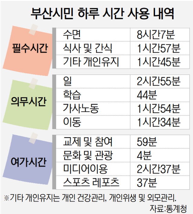 지역 통계도 일부 있다. 부산 시민들은 출퇴근에 드는 시간이 1시간 17분으로, 5년 전에 비해 2분 줄었다. 또 친구·지인들과 교제를 하거나 각종 행사 참여활동에 드는 시간이 평일엔 55분, 일요일엔 1시간 18분이었는데 이는 5년 전에 비해 각각 12분과 11분 줄어든 것이다. 부산 시민의 교제 활동이 감소한 것이다. 또 부산 시민 중 일요일에 일하는 사람은 20.9%였는데 이들은 일요일에 5시간 27분을 일한 것으로 집계됐다.