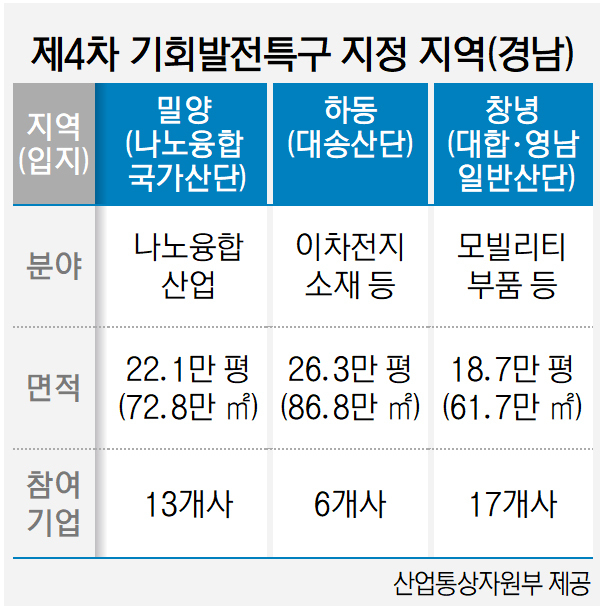 경남 기회발전특구를 세부적으로 보면 △경남 밀양 기회발전특구(나노융합국가산업단지) 22만 1000평(나노융합산업 분야)△하동 기회발전특구(대송산업단지) 26만 3000평(이차전지소재 등 분야) △창녕 기회발전특구(대합일반산업단지·영남일반산업단지) 18만 7000평(모빌리티 부품 등 분야)이다.