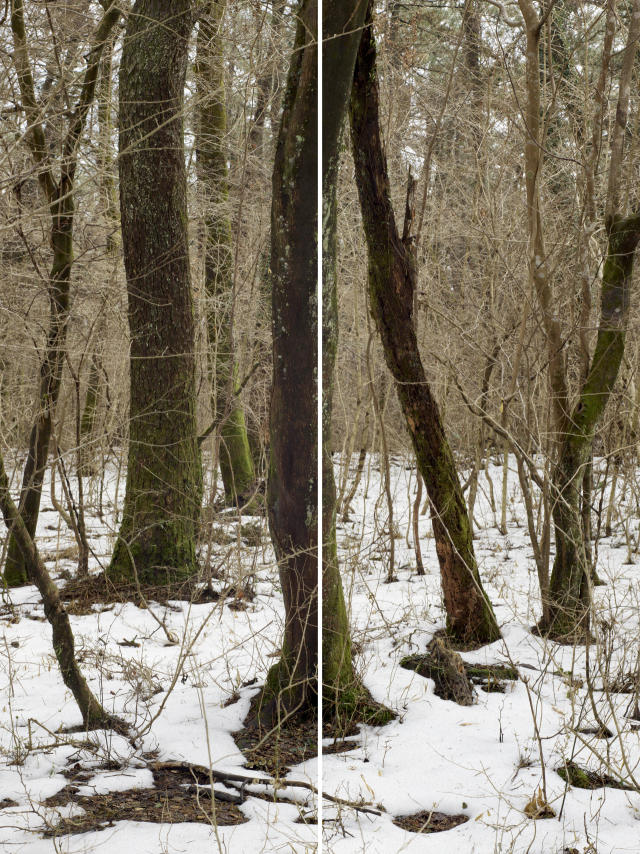 지금은 담담하게 그날의 기억을 이야기하지만, 작가로선 상당히 힘든 시간을 보낸 듯했다. 이날의 생경한 경험은, 그동안 스튜디오 베이스로 작업해 온 그를 숲으로 불러낸 계기가 되기도 했다. “이전만 해도 저는 풍경이라는 장르 또는 자연이라는 대상을 피사체로 삼는 것은 나의 영역이 아니라고 생각했거든요. 저한테는 굉장히 새로운 도전이었어요. 계속 같은 숲을 보고, 촬영했어요. 공간의 밀도, 이런 것들이 되게 실체적으로 다가오더라고요. 밀도를 이미지로 풀어낼 수 있는 방법을 찾아야겠다 싶었고, 하나의 작업 형태를 갖추기까지 1년이 걸렸습니다.”
