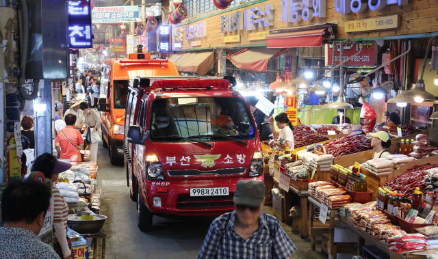 부산 부산진소방서와 부산진구청, 부전시장상인회 등이 30일 오전 부전시장에서 화재 발생을 대비해 소방차량과 주차단속차량 등을 동원, 소방통로 확보 훈련을 하고 있다. 정종회 기자 jjh@