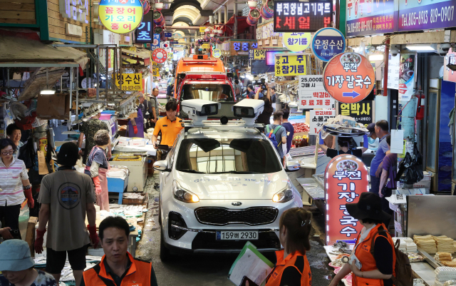 경형펌프차를 비롯한 소방차량과 주차단속차량이 부전시장 내 통로를 통과하며 상인들을 대상으로 자율정비선 준수를 위한 현장 계도와 재난 발생시 소방차의 신속한 진입을 위한 훈련을 진행했다.