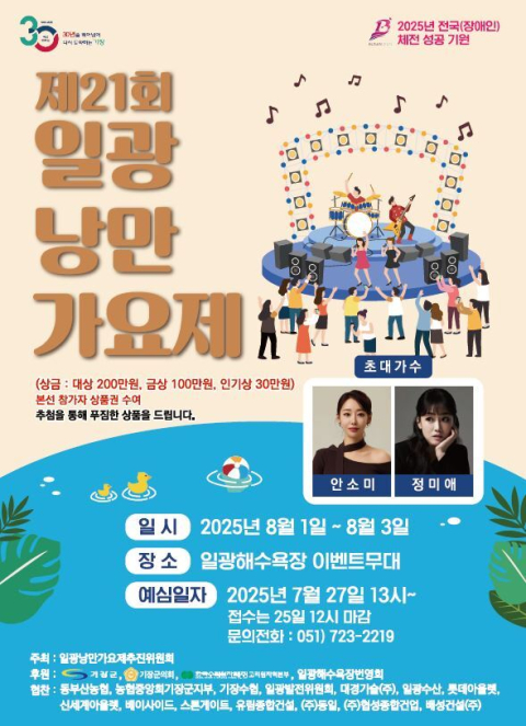 정종복 기장군수는 “이번 일광낭만가요제는 시원한 바다를 배경으로, 활기찬 무대와 다채로운 행사가 어우러진 특별한 시간이 될 것이다”라며 “많은 군민과 관광객들이 찾아오셔서 여름 바다의 낭만을 마음껏 즐기시길 바란다”라고 말했다.