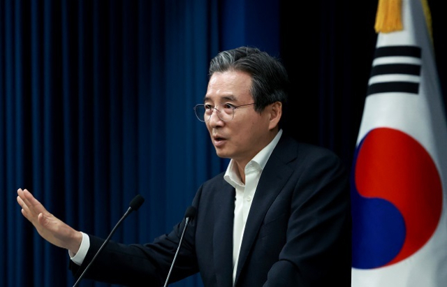 김용범 대통령실 정책실장이 31일 서울 용산 대통령실 청사에서 한미 관세 협상 타결 관련 브리핑 뒤 취재진의 질문에 답하고 있다. 연합뉴스