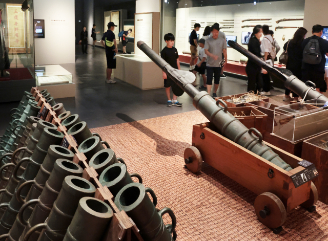 31일 광복 80주년과 해군 창설 80주년을 기념해 부산 영도구 국립해양박물관에서 열린 기획전시 ‘수군, 해전’에서 관람객들이 유물을 살펴보고 있다. 이번 전시에는 이순신 장군이 명나라 황제로부터 하사받은 ‘충무공 팔사품’(보물)과 조선 후기 수군 진영의 배치를 담은 ‘삼도수군해방총도 병풍’ 등 170여 점의 유물이 공개됐다.