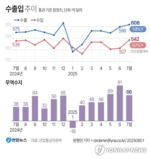1일 산업통상자원부기 발표한 ‘2025년 7월 수출입동향’에 따르면 지난 7월 우리나라 수출액은 608억 2000만 달러로 지난해 같은 달보다 5.9% 늘었다. 한국의 7월 수입액은 542억 1000만 달러로 작년 동월보다 0.7% 증가했다. 이로써 7월 무역수지는 66억 1000만 달러 흑자를 나타냈다. 월간 무역수지는 올해 1월 한때 적자를 기록한 것을 빼면 2023년 6월 이후 계속 흑자를 유지 중이다.