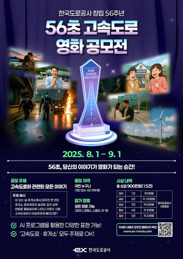 한국도로공사는 8월 1일부터 9월 1일까지 고속도로와 관련된 이야기를 주제로 ‘56초 고속도로 영화 공모전’을 개최한다고 1일 밝혔다.