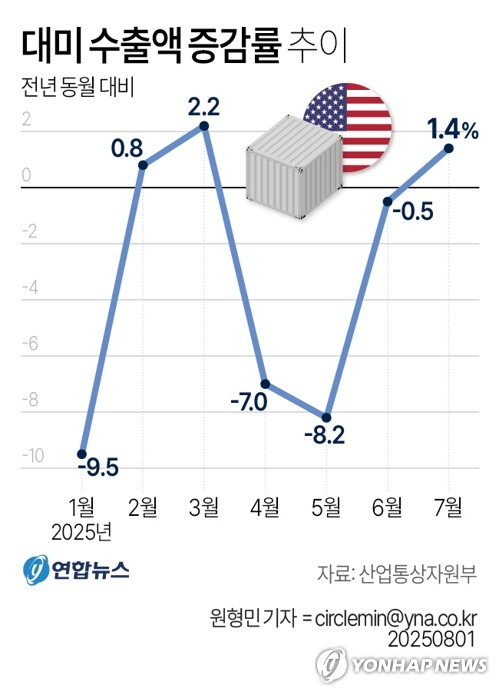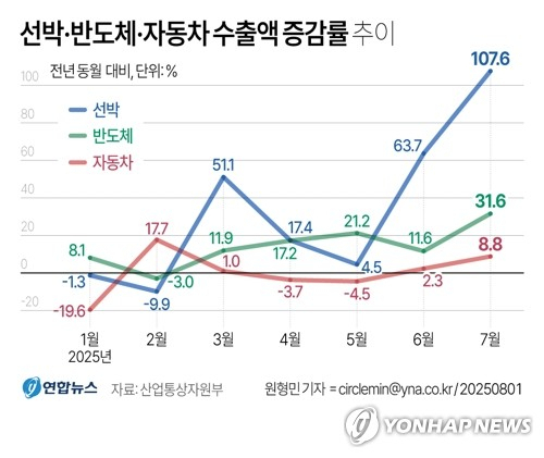 미국의 관세 영향에도 지난달 우리나라 수출이 두 달 연속 증가세를 이어가며 '선방'한 것으로 나타났다. 최대 수출품인 반도체가 역대 7월 최대 수출을 기록하며 전체 실적을 견인한 가운데 자동차, 선박 등 주력 품목이 선방한 덕분이다. 한국은 최근 관세 협상을 통해 미국이 8월로 예고한 상호 관세율을 25%에서 15%로 낮췄지만, 15% 관세 역시 수출에 적지 않은 영향을 미칠 전망이어서 미국 관세 영향 본격화에 대한 우려의 목소리가 높다.