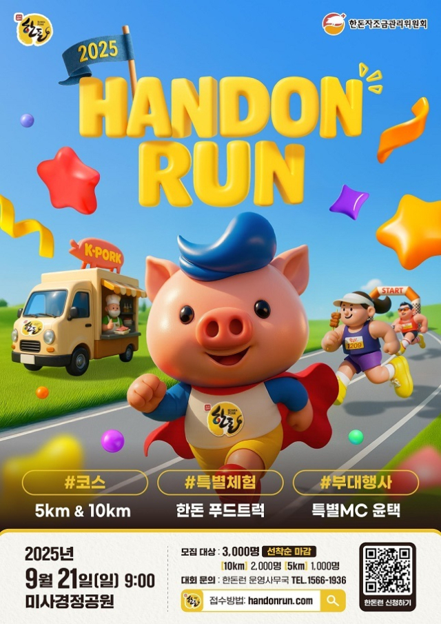 한돈런 신청 접수는 8월 1일부터 ‘한돈런 공식 홈페이지’를 통해 총 3000명(10km 부문 2000명, 5km 부문 1000명)을 선착순으로 받는다. 참가비는 1인당 5만 원이며, 참가자 전원에게는 기념 티셔츠를 비롯해 한돈 굿즈 및 한돈 도시락 등이 증정될 예정이다.