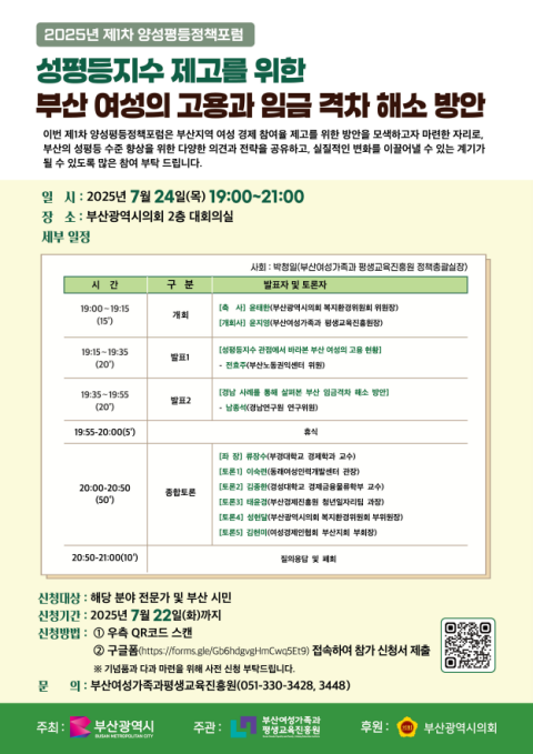 윤지영 여평원 원장은 “이번 포럼이 부산 여성의 일자리와 임금 격차 문제를 해결하기 위한 실질적인 정책 방향을 고민하는 계기가 되기를 바란다”며 “앞으로도 여평원은 성평등한 일터 환경 조성을 위해 지속적으로 연구하고, 다양한 주체들과 협력하겠다”고 밝혔다.