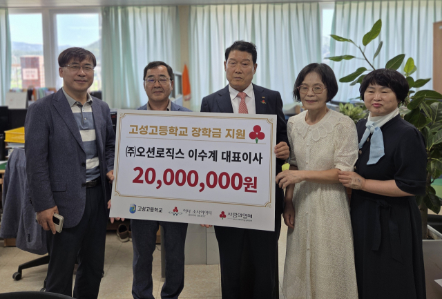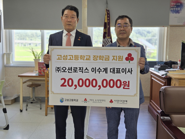 경남 고성군 고성고등학교 졸업생이 후배들을 위한 기부로 지역사회에 큰 감동을 주고 있다. 지난달 25일 고성고등학교 졸업생 이수계 동문(7회·(주)오션로직스 대표이사)은 가정 형편이 어려운 후배들의 학업 지원과 학교 교육 환경 개선을 위한 장학금 2000만 원을 모교에 전달했다.