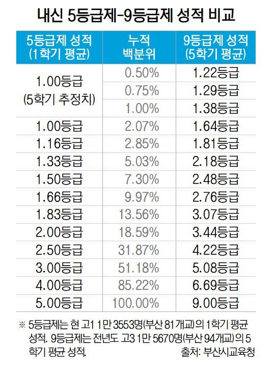 부산시교육청 산하 부산진로진학지원센터(이하 센터)는 부산 지역 81개 고등학교 1학년 학생 1만 3553명의 올해 1학기 성적을 수집해 분석했다. 현재 고1은 기존 9등급제 대신 5등급제가 처음 적용된 학년이다. 또한 이들 성적을 9등급제 기준으로 환산하기 위해 전년도 부산 지역 고3 학생 1만 5670명(94개교)의 5학기 평균 성적을 토대로 비교했다. 수시전형에서 내신 성적은 3학년 1학기(5학기)까지 반영된다.