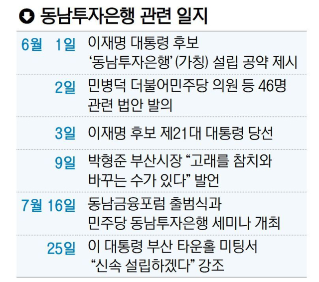 이 대통령은 후보 시절 “동남투자은행은 5극 3특 국가 균형발전 전략의 핵심인 메가시티 조성에 꼭 필요한 지역 기반 정책 금융기관”이라며 공약을 제시했고, 지난달 25일 부산에서 열린 타운홀 미팅에서도 “부산에 동남권투자은행을 신속하게 설립하겠다”며 의지를 재확인했다.