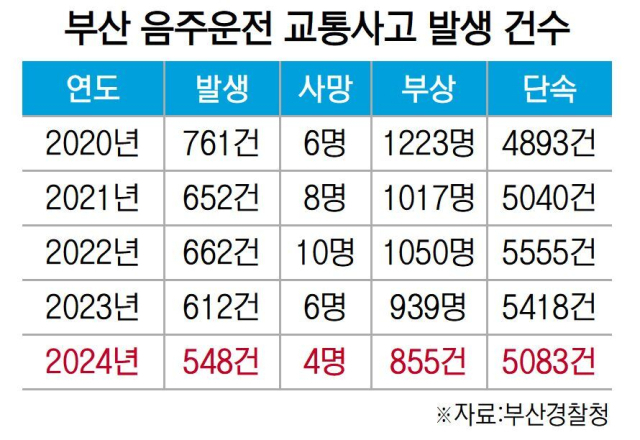 경찰이 이같은 대응에 나선 배경에는 음주운전의 심각성이 여전히 높다는 판단이 있다. 최근 5년간 단속 건수와 사고는 줄고 있지만, 시민 안전을 위협하는 고위험 운전 행위가 반복되고 있다. 경찰에 따르면 지난 5년간 부산 시내 음주운전 교통사고 건수는 완만한 감소세를 보인다. 2020년 761건, 2021년 652건, 2022년 662건, 2023년 612건, 2024년 548건으로 나타났다.