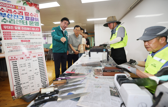 부산진구청이 생활편의를 위해 2025년 3분기 ‘부산진구 칼갈이 수리센터(수리수리칼수리)’를 운영해 주민들의 큰 호응을 얻고 있다. 6일 오후 김영욱 부산진구청장이 신개금LG아파트에 마련된 수리센터를 점검하고 있다. 9월 11일까지 동별 지정 장소를 순회하는 칼갈이 센터는 매주 월~목 오전 10시부터 오후 3시 30분까지 운영된다.