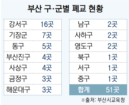 현재 부산 전체 616개 학교 가운데 151곳이 소규모 학교로 분류된다. 전체 학교의 약 4곳 중 1곳이 잠재적 폐교 위험군에 속해 있는 셈이다. 소규모 학교라고 해서 반드시 폐교 대상으로 지정되는 것은 아니지만, 학생 수가 적어 학교 운영에 제약이 따르는 만큼 폐교 검토의 출발점이 된다.