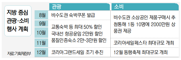 또한 이달 시작하는 숙박세일 페스타를 시작으로 △9월 여행가는 가을 캠페인 및 동행축제 △10월 코리아 듀티프리페스타 △11월 코리아세일페스타 △12월 코리아그랜드세일 등 주요 관광·소비행사를 역대 최대 규모로 열고 지방소비 촉진 프로그램을 집중 편성할 계획이다.