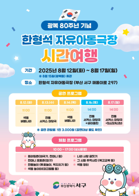 부산 서구(구청장 공한수)는 오는 12일부터 17일까지(광복절 휴관) 한형석 자유아동극장에서 ‘광복 80주년 기념 한형석 자유아동극장 시간여행’ 을 개최한다.