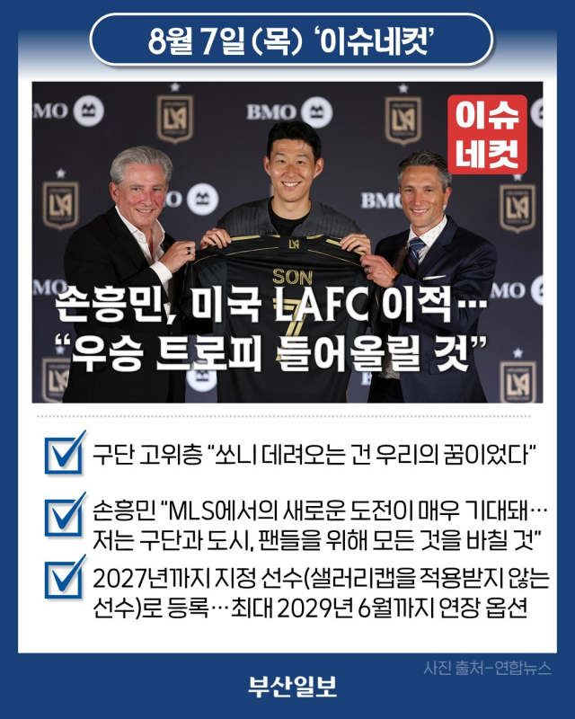 잉글랜드 프로축구 토트넘에서 10년을 활약하고 미국프로축구(MLS) 로스앤젤레스FC(LAFC)로 떠난 손흥민(33)의 이적이 공식 발표됐습니다. LA 구단은 "손흥민은 2027년까지 지정 선수(샐러리캡을 적용받지 않는 선수)로 등록된다"고 밝혔는데요. 2028년까지 연장 옵션이 있고, 추가로 2029년 6월까지의 옵션도 포함됐습니다. 프로 생활 중 처음으로 유럽 밖에서 뛰게 된 손흥민은 "MLS에서의 새로운 도전이 매우 기대된다. 저는 이 구단과 도시, 팬들을 위해 모든 것을 바치고 우승 트로피를 들어올리기 위해 LA에 왔다"며 기대감도 나타냈습니다. LAFC 공동 구단주인 베넷 로즌솔은 "쏘니를 LAFC와 우리 도시로 데려오는 것은 몇 년 동안 우리의 꿈이었다"며 "저와 제 파트너들은 쏘니라는 '선수'와 쏘니라는 '사람'에 대한 엄청난 존경심을 가지고 있다"고 환영 인사를 전했습니다.