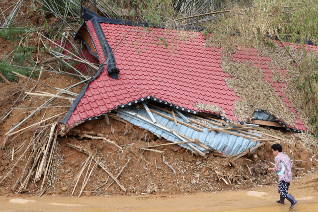 7일 경남 합천군 삼가면의 수해 지역인 송곡마을에서 한 주민이 산사태로 인해 토사에 묻힌 가옥 앞을 지나고 있다. 특별재난지역으로 추가 지정된 합천군은 피해 복구 작업이 진행 중이다. 연합뉴스