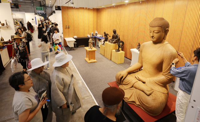 7일 부산 해운대구 벡스코 제1전시장에서 열린 ‘2025부산국제불교박람회’에서 관람객들이 전시물을 살펴보고 있다. 10일까지 열리는 이번 박람회는 ‘불교코어’를 주제로 다양한 불교문화와 명상 문화전 및 명상 공예전, 명상 예술전, 발우공양 및 사찰음식전 등을 체험할 수 있다.