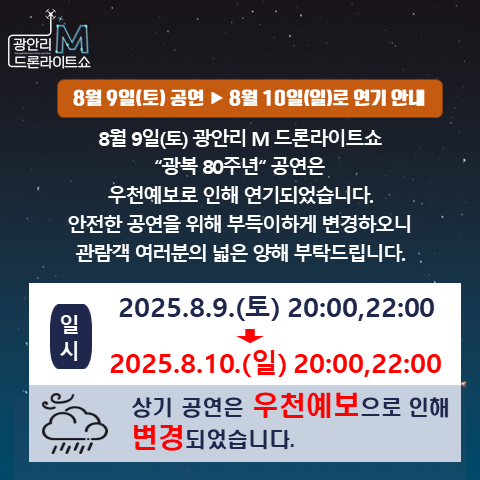 8월 8일 09시 기준 기상청 예보에 따르면 8월 9일 부산 지역에 150mm 이상의 비가 예상됨에 따라 공연 일정을 부득이하게 변경하게 됐다. 특히 이번 공연은 광복 80주년을 맞아 독립운동가들의 모습을 드론으로 재현하는 특별한 의미가 있는 쇼인 만큼 보다 안전하고 뜻깊은 공연을 위해 날짜를 조정하게 됐다고 설명했다.