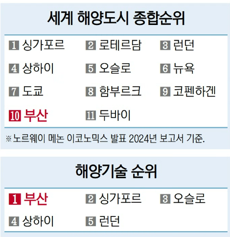 특히나 부산은 노르웨이 메논 이코노믹스가 격년마다 발표하는 메논 보고서 ‘세계 선진 해양도시’에서 2024년 조사대상 50개 세계 해양도시 중 종합 10위를 기록한 도시로 세계적으로 경쟁력 있는 해양도시다. 1위를 기록한 싱가포르, 4위 상하이, 7위 도쿄에 이어 아시아에서는 4위에 해당한다.