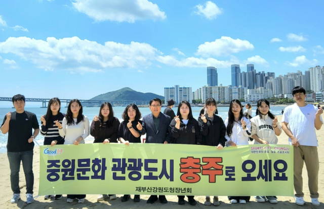 재부산강원도청장년회(회장 안정태, 충주시 명예시민)는 11일 여름철 피서객이 몰린 부산 수영구 광안리해수욕장에서 자연과 문화가 공존하는 여름 휴양지 충주를 알리는 홍보 캠페인을 전개했다.