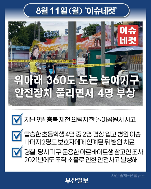 지난 9일 충북 제천 의림지 놀이공원에서 위아래로 360도 회전하는 놀이기구(크레이티 서프)의 안전장치가 풀려 탑승객이 다친 사고와 관련해 경찰이 사고 원인 규명에 나섰습니다. 당시 놀이기구에 타고 있던 초등학생 4명 가운데 2명은 경상을 입은 뒤 병원으로 옮겨졌고, 나머지 2명도 보호자에게 인계돼 병원 치료를 받았는데요. 경찰은 사고 당일 운용을 맡았던 아르바이트생을 참고인 신분으로 조사한 가운데, 국립과학수사연구원, 안전성 검사업체 등과 현장 감식을 진행하고 오작동 여부를 비롯해 안전바가 제대로 작동했는지를 집중적으로 살필 예정입니다. 해당 놀이기구는 2021년 6월에도 조작 소홀로 안전사고가 발생했고, 시는 놀이공원 측에 시정 명령을 했던 것으로 알려졌습니다.