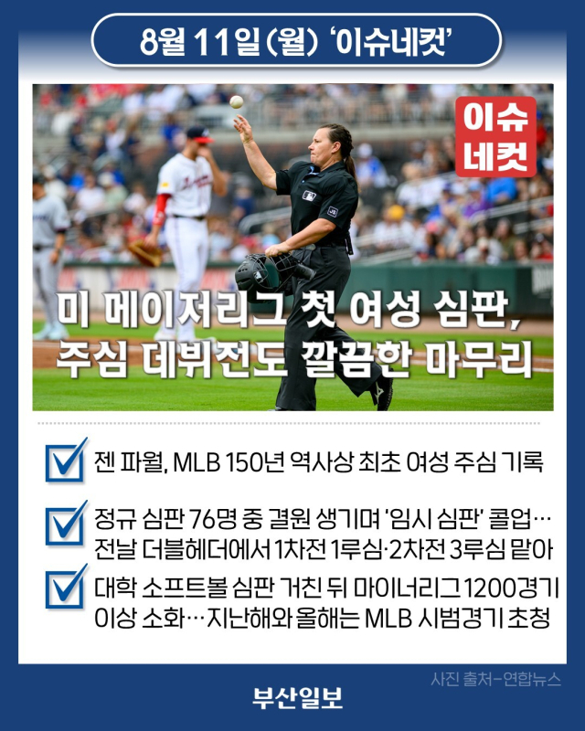 미국프로야구 메이저리그(MLB) 사상 첫 여성 심판이 된 젠 파월(48)이 홈플레이트 뒤에서 마스크를 쓰고 최초의 여성 주심으로서 마이애미 말린스와 애틀랜타 브레이브스의 정규 경기를 성공적으로 진행했습니다. 메이저리그 150년 역사상 최초의 여성 심판인 파월은 전날 더블헤더 1차전에서 1루심으로 데뷔했으며 2차전에서는 3루심을 맡았는데요. 정규 심판이 76명인 메이저리그는 시즌 중 부상이나 휴가로 결원이 생기면 마이너리그에서 심판을 불러올립니다. 다만 파월은 이번 시리즈에 임시 심판으로 투입됐기에 다음 메이저리그 경기 일정은 결정되지 않았습니다. 앞서 미국대학스포츠협회(NCAA) 소프트볼 심판을 거쳐 2016년부터 마이너리그에서 1200경기 이상 심판으로 활동한 파월은 지난해와 올해 메이저리그 시범경기에도 초청된 바 있습니다.