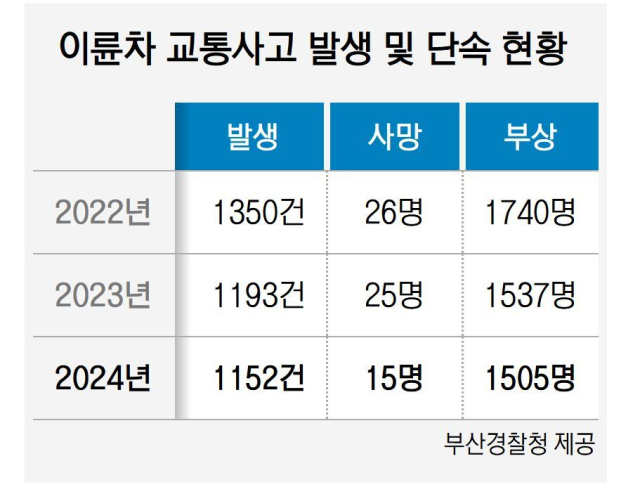 12일 부산경찰청에 따르면 지난해 이륜차 교통사고는 1152건이다. 2022년 1350건, 2023년 1193건 등 매년 감소하는 추세 속에서도 매년 1000건이 넘는 교통사고가 발생하고 있다.