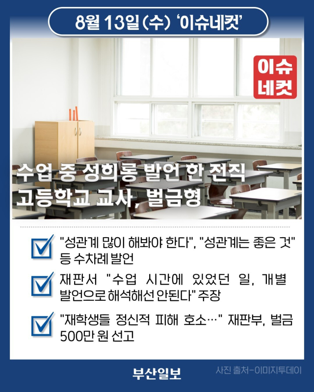 수업 시간에 성희롱 발언을 한 전 고등학교 교사가 아동복지법 위반 혐의로 벌금 500만 원을 선고받았습니다. 제주지역 고등학교 교사로 근무한 50대 A 씨는 2023년 3월과 4월 수업 중 수차례 성적인 발언을 한 혐의를 받습니다. A 씨는 수업 도중 성관계를 뜻하는 단어가 나오자 "성관계를 많이 해봐야 한다. 성관계는 좋은 것이다" 등의 발언을 한 것으로 파악됐습니다. 재판에서 A 씨는 "수업 시간에 있었던 일로 개별적인 발언으로 해석하면 안 된다"며 혐의를 부인했습니다. 하지만 재판부는 "증인으로 나온 당시 재학생들이 피고인 발언으로 인한 정신적 피해를 호소하는 등 법정 증언이 명확하고 수사 핵심 부분과도 동일하다"며 받아들이지 않았습니다. 또 "피고인 변호인 측에서 악의가 아니었다는 점을 강조했지만, 사회 통념과 피해자가 받아들이는 것은 다르다"며 A 씨 혐의를 유죄로 판단했습니다. 성폭력 치료프로그램 40시간 이수와 3년간 아동·청소년·장애인 관련 시설 취업제한도 명령했습니다.