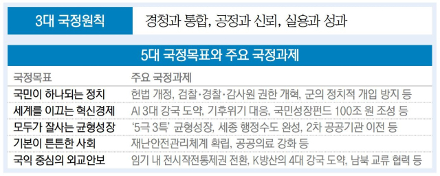 3대 국정 원칙은 △경청과 통합 △공정과 신뢰 △실용과 성과로, 이를 토대로 5대 국정 목표가 설정됐다. △국민이 하나되는 정치 △세계를 이끄는 혁신 경제 △모두가 잘사는 균형성장 △기본이 튼튼한 사회 △국익 중심의 외교 안보 등의 5대 국정 목표 아래 23대 추진 전략과 123대 국정 과제가 놓였다.