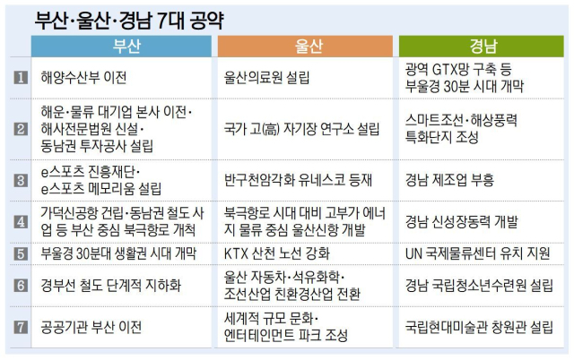 부산의 7대 공약으로는 △해수부 이전 △100대 기업 유치 △e스포츠 진흥재단·메모리움 설립 지원 △북극항로 선도 육해공 트라이포트 육성 △광역교통망 구축 △경부선 철도 단계적 지하화 △공공기관 재배치 등의 내용이 담겼다. 이 대통령이 대선 기간부터 약속했던 해수부 이전을 비롯해 해운 대기업 이전·해사법원 설립·동남권 투자은행 설립 등의 내용은 ‘100대 기업 유치’ 내 세부 추진 과제에 포함됐다.