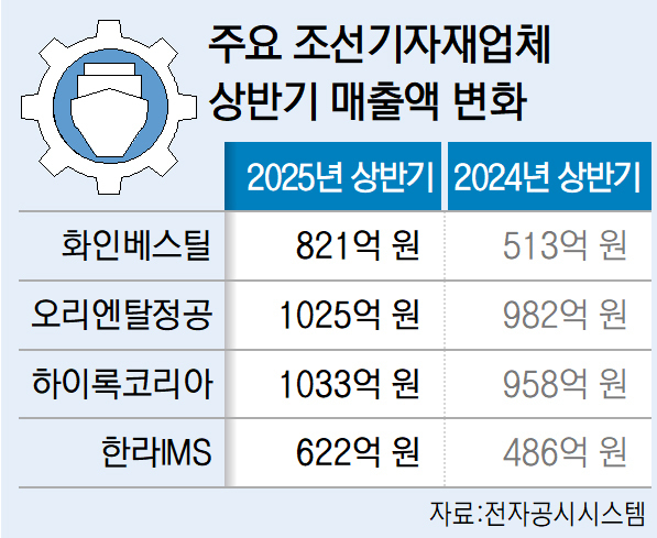 매출이 크게 늘어난 기업은 화인베스틸만이 아니다. 지역 주요 조선기자재업체들의 실적이 크게 늘고 있다. 선박용 기계 장비를 만드는 오리엔탈정공은 올해 상반기 매출액 1025억 원을 기록했다. 지난해 같은 기간 982억 원에 비해 20억 원 이상 증가한 수치다. 관이음쇠(피팅)를 제작하는 하이록코리아(주)도 상반기 매출액 1033억 원으로 지난해 958억 원에 비해 7.8% 증가한 것으로 나타났다.