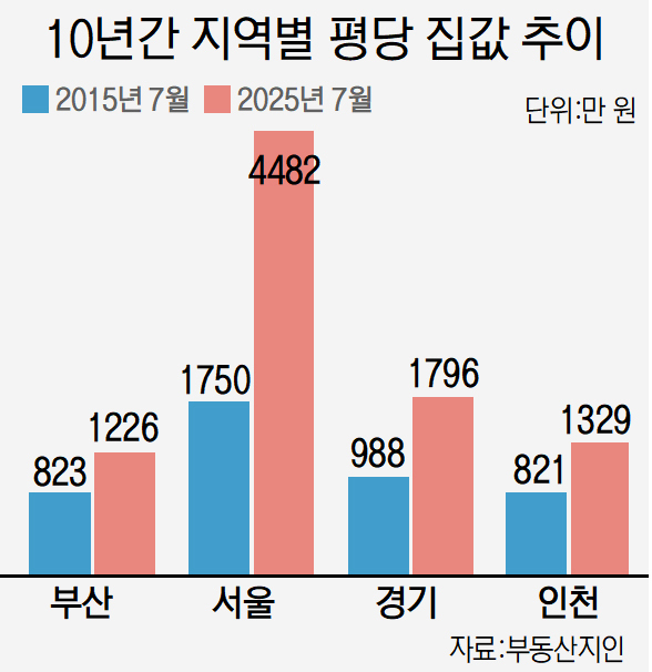 반면 2015년 서울의 평당 집값은 1750만 원이었는데, 10년 뒤에는 4482만 원으로 156.1%나 올랐다. 부산의 집값 상승률에 약 3.2배에 달하는 수치다.