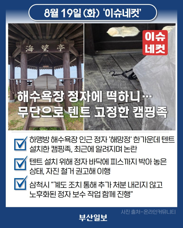 강원 삼척의 한 해수욕장 정자에 캠핑족이 무단으로 텐트를 설치한 사례가 최근 온라인 커뮤니티에 알려지며 논란이 됐습니다. 19일 삼척시 등에 따르면 지난 6월 말 한 캠핑족이 삼척시 근덕면 하맹방 해수욕장 인근에 있는 정자 '해망정' 한가운데 텐트를 설치했는데요. 텐트 설치를 위해 정자 바닥에 피스까지 박아 놓은 상태였습니다. 삼척시는 해수욕장법에 따라 해당 사례를 확인하고 해수욕장 개장 전 자진 철거를 권고했습니다. 시는 계도 조치를 통해 추가 처분은 내리지 않았으며, 노후화된 정자 보수 작업도 함께 진행했다고 밝혔습니다.